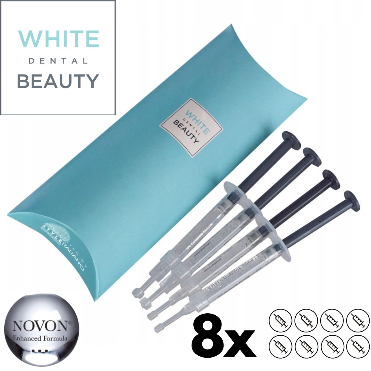 Professional teeth whitening system in the form of whitening gels. They contain the patented NOVON® formula, which ensures optimal whitening effect. NOVON® technology remains stable with a neutral pH in the syringe, and upon contact with saliva, the pH increases rapidly to alkaline, which causes the release of hydroxide ions responsible for effective whitening. Thanks to this unique technology, White Dental Beauty gels are characterized by whitening speed, effectiveness, and safety.